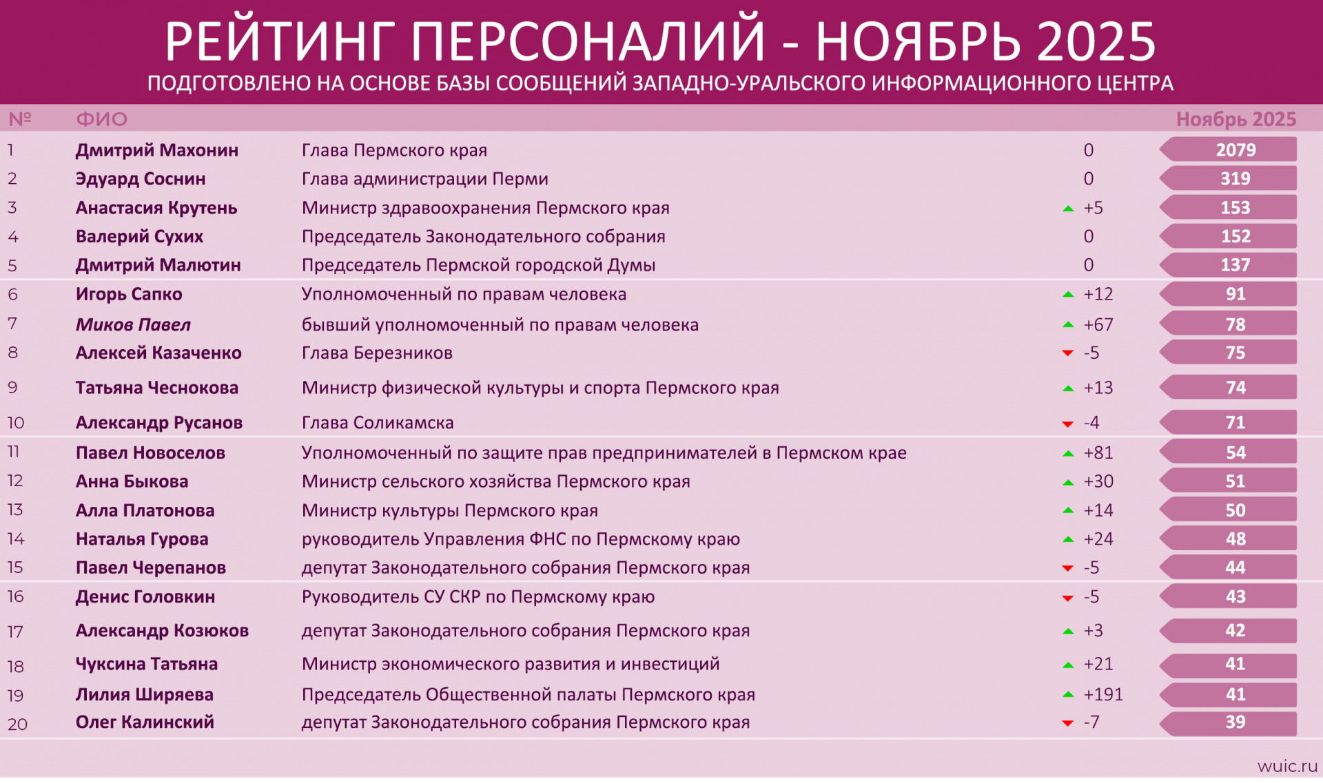 | 29 | Анна Благонравова | ректор ПГМУ | 30 | -13 |