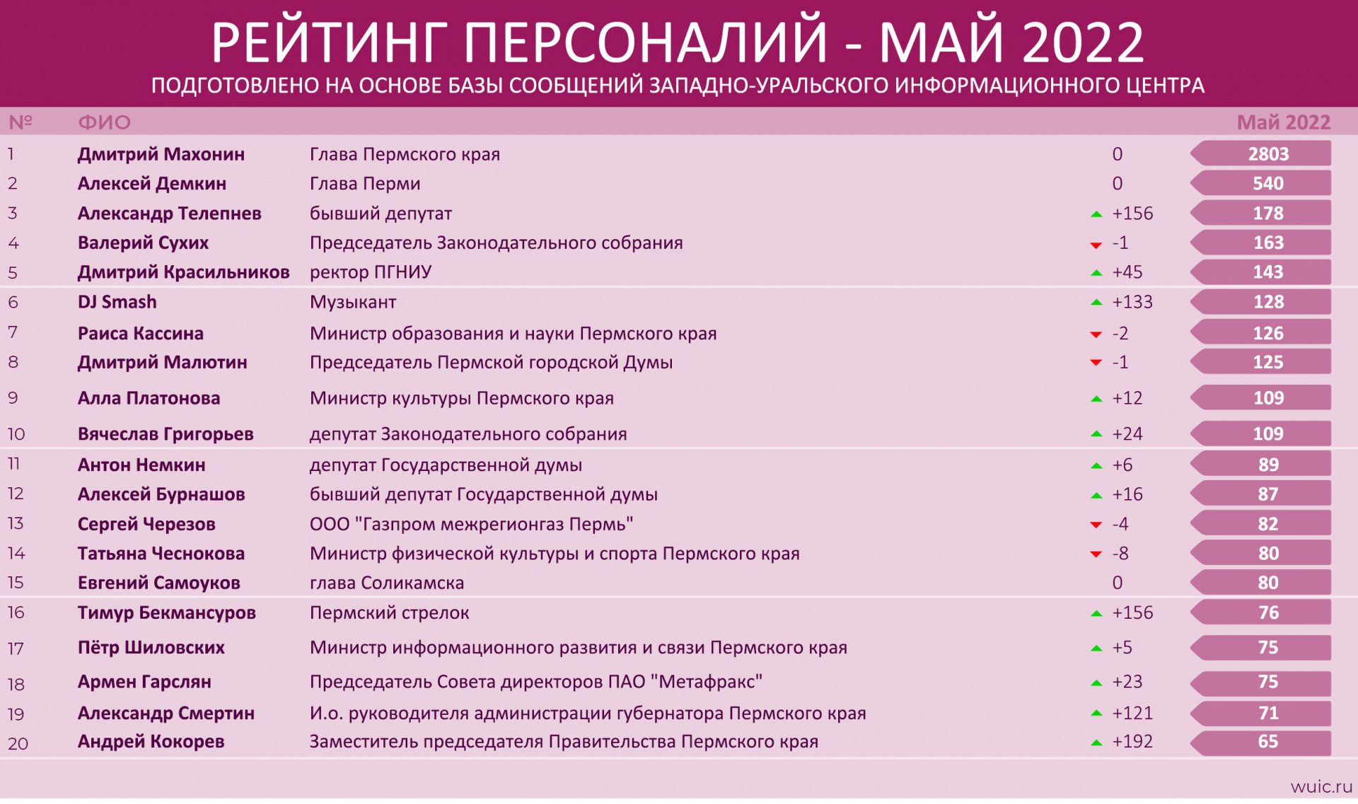 | 8 | Дмитрий Малютин | Председатель Пермской городской Думы | 125 | -1 |