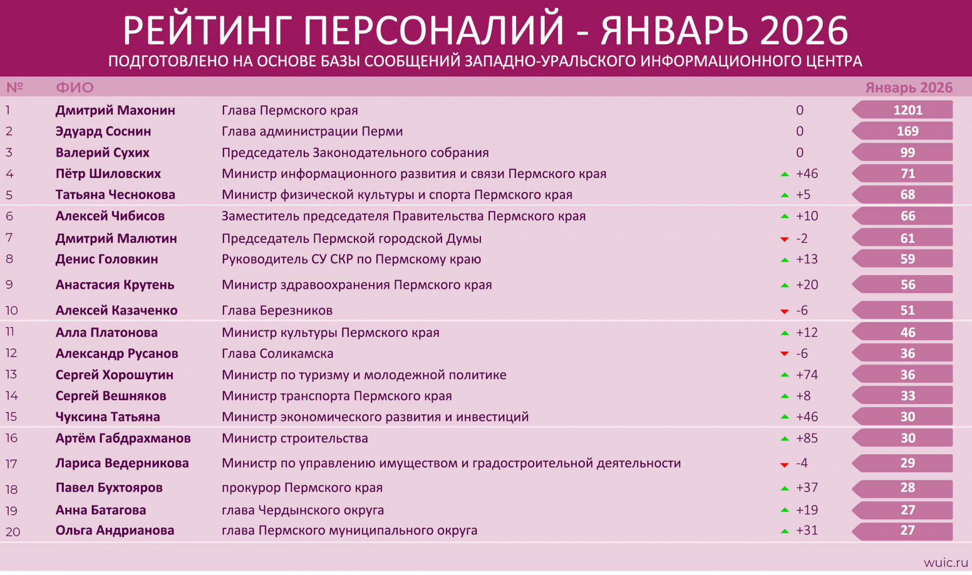 | 17 | Лариса Ведерникова | Министр по управлению имуществом и градостроительной деятельности Пермского края | 29 | -4 |